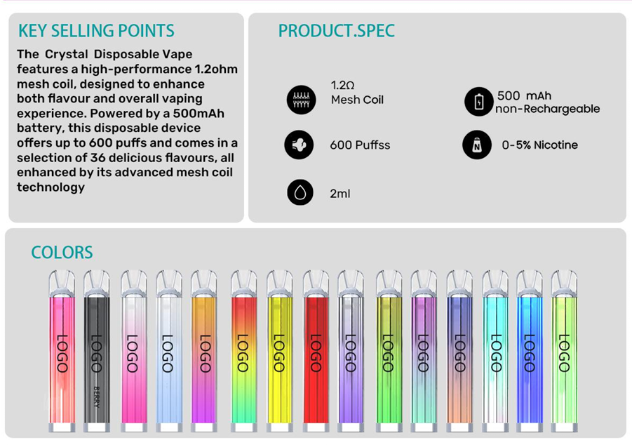 The Crystal Disposable Vapefeatures a high-performance 1.2ohmmesh coil, designed to enhanceboth flavour and overall vapingexperience.Powered by a 500mAhbattery,this disposable deviceoffers up to 600 puffs and comes in aselection of 36 delicious favours, allenhanced byits advanced mesh coiltechnology