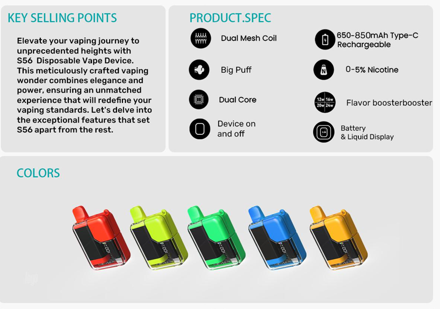 Elevate your vaping journey tounprecedented heights withS56 Disposable Vape Device.This meticulously crafted vapingwonder combines elegance andpower,ensuring an unmatchedexperience that will redefne yourvaping standards. Let's delve intothe exceptional features that setS56 apart from the rest.