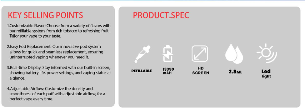 1.Customizable Flavor: Choose from a variety of flavors withour refllable system, from rich tobacco to refreshing fruit.Tailor your vape to your taste.